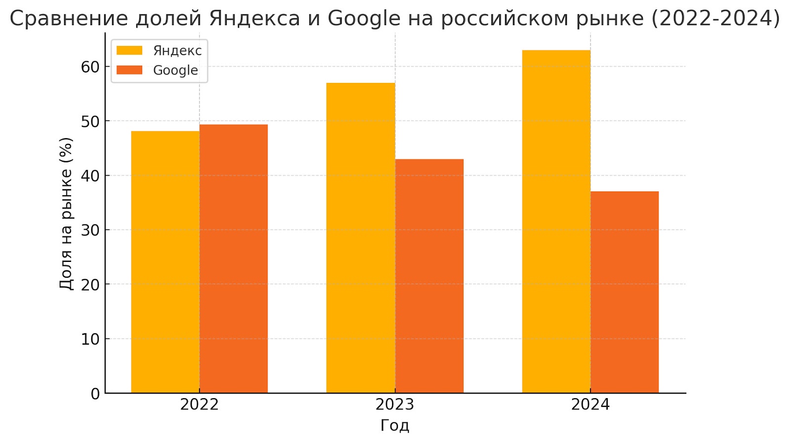 В 2024 году Яндекс значительно укрепил свои позиции на российском рынке, увеличив свою долю до 63,8%, в то время как доля Google снизилась до 36,95%. Рост доли Яндекса в Рунете связан с увеличением пользовательского трафика и внедрением новых рекламных решений, что открывает перед рекламодателями дополнительные возможности.