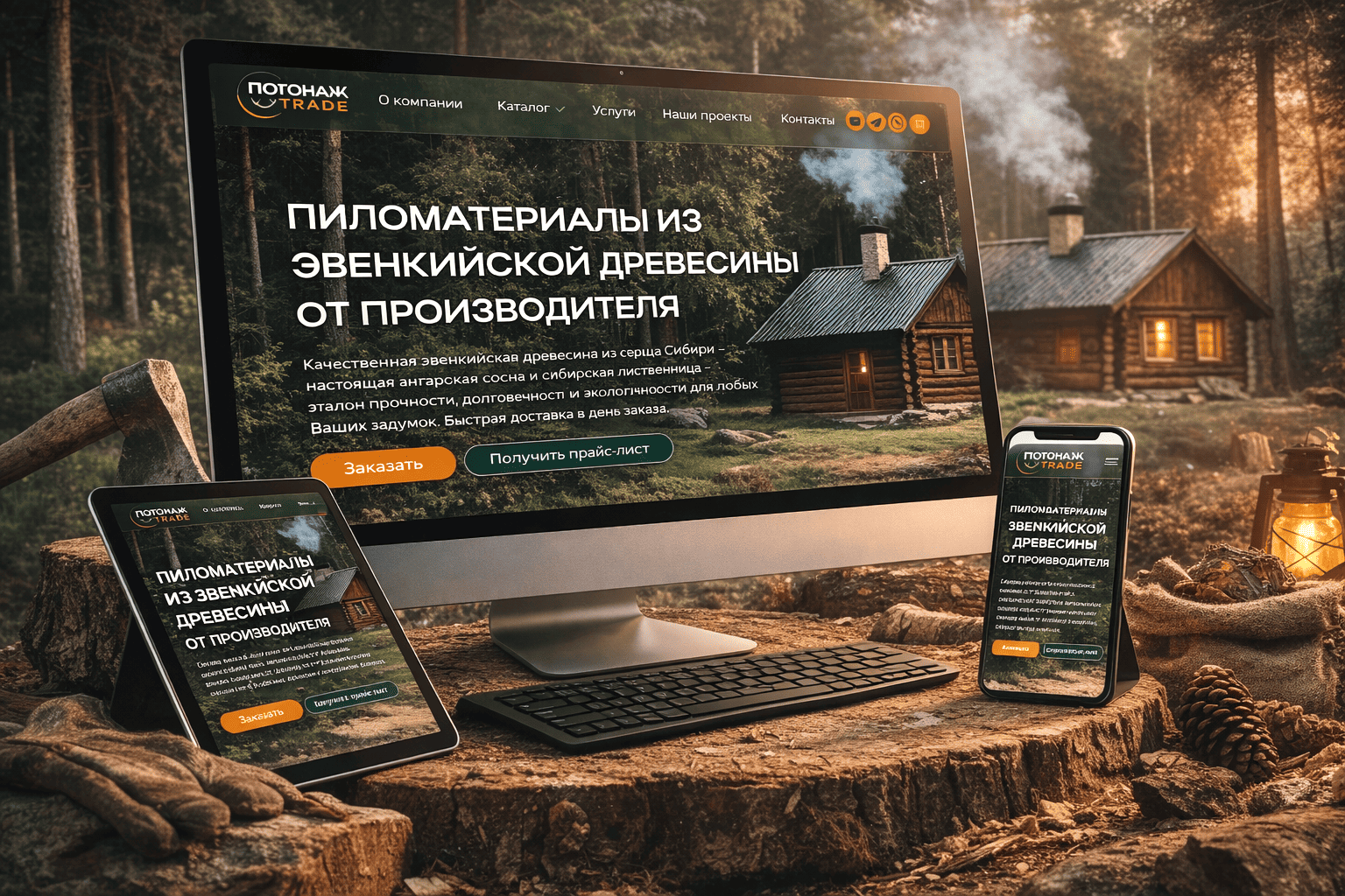 На первом экране Pogonazhtrade.ru клиент видит живой источник строительного материала: дом в тайге, плотный лес, спокойный масштаб, прямую связь сырья и результата. Проект реализован студией РОСТСАЙТ: дизайн сайта и продвижение в Яндексе. Визуальный ход сразу фиксирует происхождение древесины и снижает сомнения в качестве, что, по данным Nielsen Norman Group, повышает первичное доверие B2B-аудитории на 20–25 %. Для сайтов производителей эвенкийской древесины это напрямую отражается на росте конверсии просмотра в заявку до +18–22 %, поскольку заказчик быстрее принимает решение о заказе.