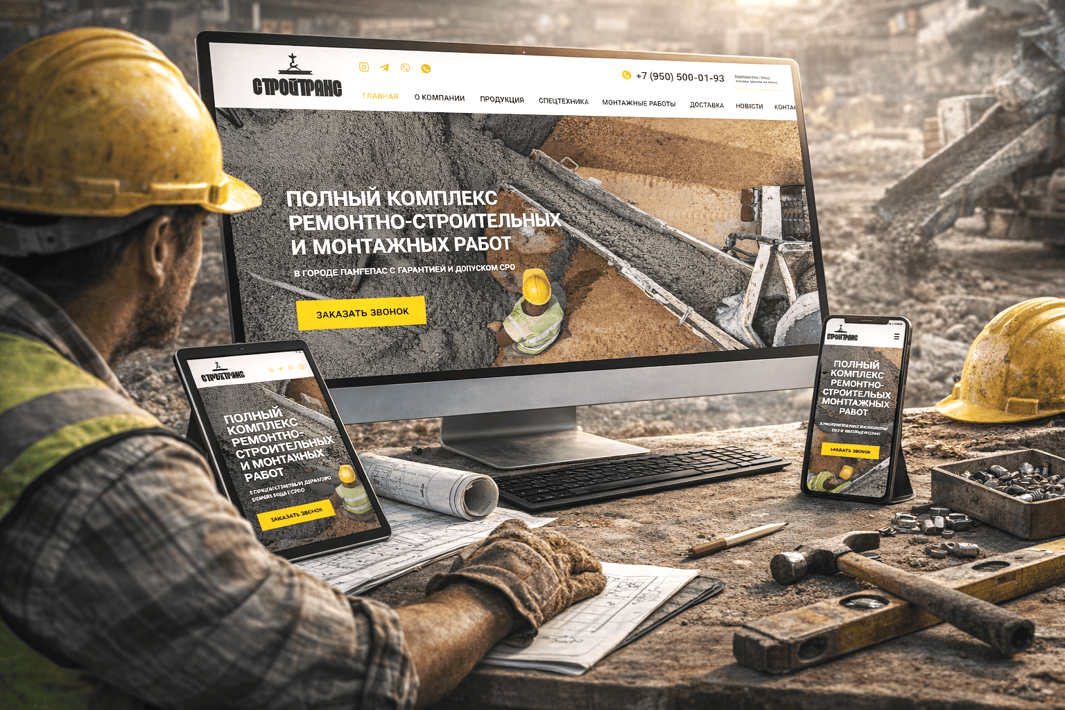 В дизайне портала Stroytrans86.ru сразу раскрывается сцена реального труда: горячий бетон, живая масса материала, люди в касках, движение, вес, ответственность. Картинка дышит производством, задает ощущение надежности и вовлеченности, формирует уважение к масштабу задачи еще до чтения заголовков. Эмоциональный вход используют лучшие сайты для строительных компаний, когда атмосфера создает доверие без слов и обещаний.