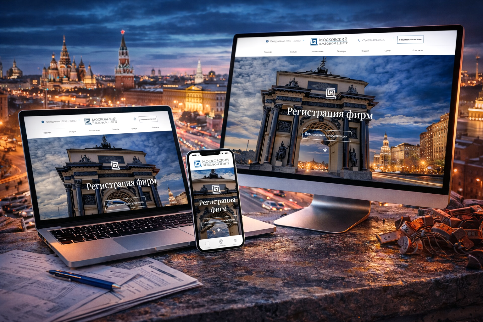 Арка Триумфа под драматическим небом — визуальный символ власти и порядка. Каменные колонны, рельефы, статуи — все на Mospravcen.ru работает как цифровой фасад доверия: клиент приходит сюда, потому что видит масштаб. Лучшие сайты для бизнеса превращают грамотное оформление страницы в конкурентное преимущество. Заголовок «Регистрация фирм» — вынесен по центру, будто надпись на мемориальной плите: четкий, без эмоций, с весом юридической силы.
